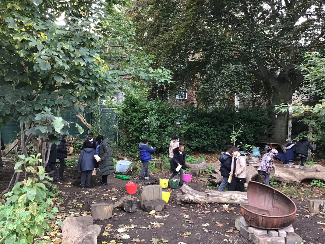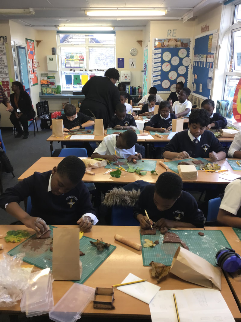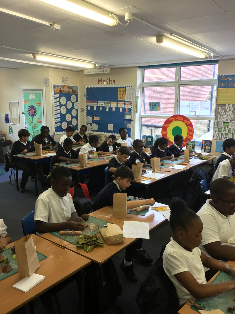 We analysed the different medium and materials he loves working with and then foraged in the school's forest garden for leaves, twigs and other materials that we would use. Back in class, we worked with clay and our leaves/twigs to create our own textile patterns. By the end of the lesson, we were covered in flour but we thoroughly enjoyed the experience.