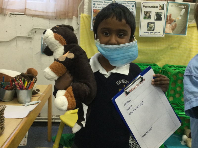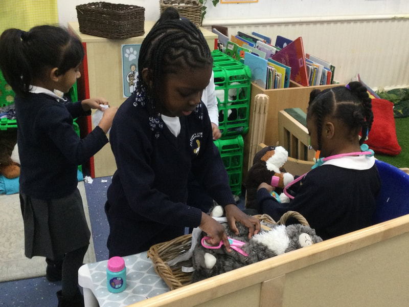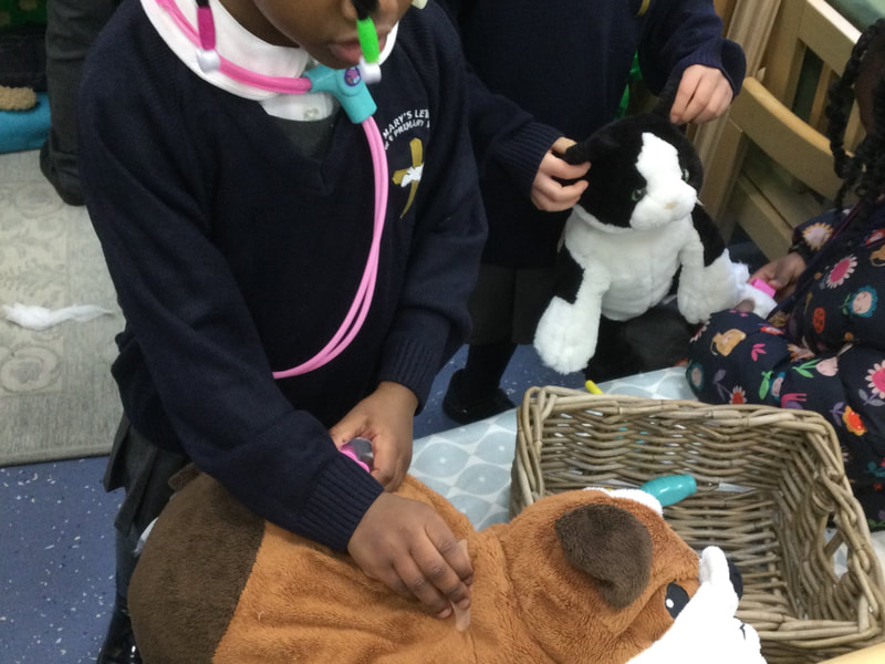 This term, Reception class have become vets! They are taking such good care of their patients. The children are delivering injections, putting on bandages, and booking appointments.